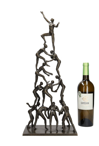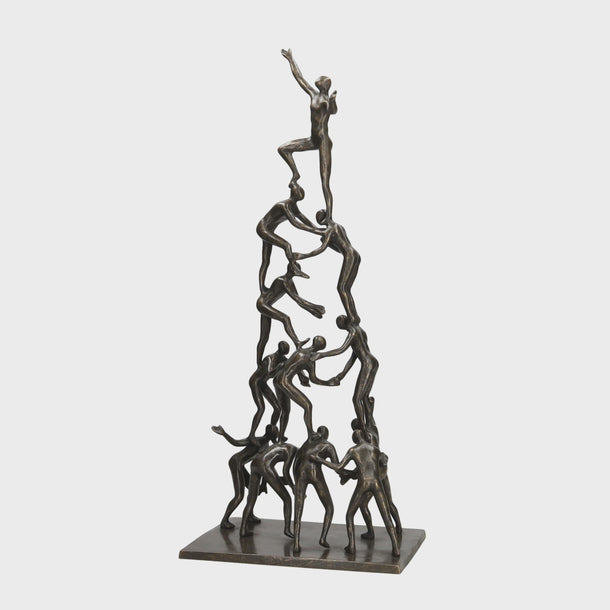 This striking bronze human tower sculpture is a powerful representation of unity, strength, and leadership. With its acrobatic design, it portrays human figures balanced together, symbolizing resilience, teamwork, and the pursuit of collective goals. Its refined bronze patina enhances the sculptural form, creating a piece that feels both timeless and modern.