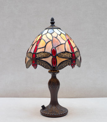 Tiffany Dragonfly Stained Glass Table Lamp | 35.5 cm / 14 in | Cream shade, red cabochons, bronze style base