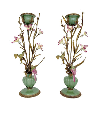 Elegant set of two tall green candle holders, adorned with decorative birds and flowers. Perfect as a housewarming gift, birthday gift, or luxury home décor accent that adds charm and sophistication to any setting.