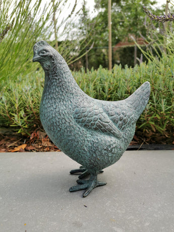 This bronze rooster sculpture is a finely crafted decorative piece that adds charm and character to any garden or outdoor space. Made from solid bronze, it features intricate detailing and a beautiful green blue patina that gives it a natural and timeless appearance. Compact yet expressive, this rooster works perfectly as a garden accent or as a thoughtful gift for outdoor decor lovers.