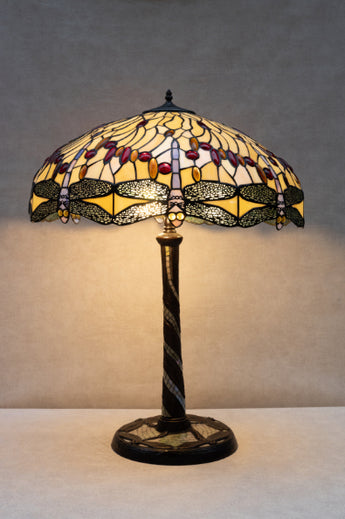 This Tiffany style lamp features an oversized dome shade in creamy stained glass with a classic dragonfly border.