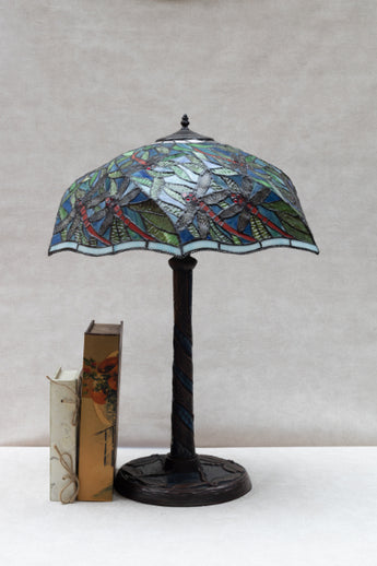 This Tiffany style lamp features a wide stained glass shade in green and blue tones with red dragonfly accents.
