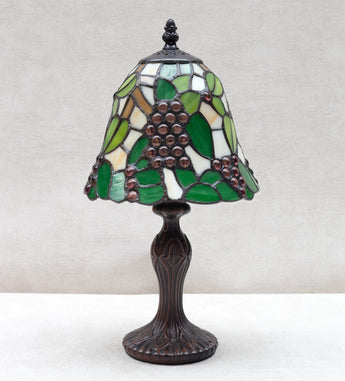 This Tiffany style table lamp features a green and cream stained glass shade with grape cluster jewel accents.