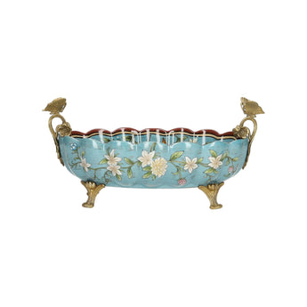 Elegant blue porcelain bowl with bronze butterfly details and floral motifs. A luxurious decorative centerpiece for dining tables, sideboards, or mantels, blending artistry with timeless sophistication.