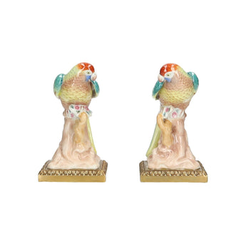 A beautiful set of two porcelain parrots elegantly perched on bronze bases. Crafted from high-quality porcelain with detailed bronze ornaments, this luxurious pair adds a touch of sophistication and artistry to any interior. Their refined design and exquisite craftsmanship make them perfect as decorative accents or as an elegant centerpiece in a stylish home.