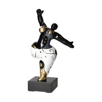 A contemporary figurine of a plump lady dancer in elegant black, white, and gold tones. Made from high-quality resin, this sculpture radiates sophistication and joy. Its stylish color palette and graceful design make it a refined yet cheerful eye-catcher that adds modern elegance to any interior.