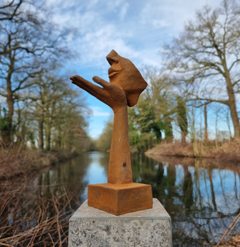 This expressive cast iron sculpture captures both modern style and heartfelt symbolism, offering a meaningful decorative accent for interiors and gardens alike.
