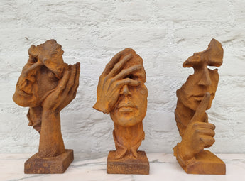 Add modern elegance to your home or garden with this set of 3 cast iron "Hear No Evil, See No Evil, Speak No Evil" face sculptures. Minimalist and industrial, these eye-catching pieces suit both indoor and outdoor spaces.