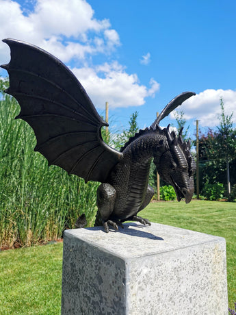 Bring mythical elegance to your garden with this large bronze dragon fountain sculpture. Featuring a functional water connection, this detailed piece can serve as a water spitter or as a striking decorative centerpiece in any outdoor space.