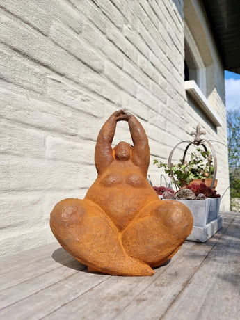 Add modern elegance and serenity to your home or garden with this handcrafted cast iron meditating woman sculpture. Depicting a graceful stretching pose, this abstract figure radiates calm and harmony. The natural rust patina evolves beautifully over time, giving each piece its own unique character. Perfect for both indoor and outdoor display, it adds a peaceful and artistic touch to any space.