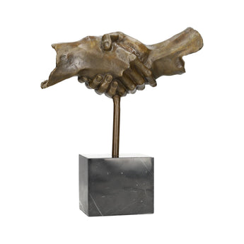 A very beautiful modern bronze sculpture of two hands joining in a handshake. This expressive piece symbolizes unity and connection, making it a meaningful addition to any interior. The bronze finish and marble base give it a refined and elegant look that suits both modern and classic spaces.