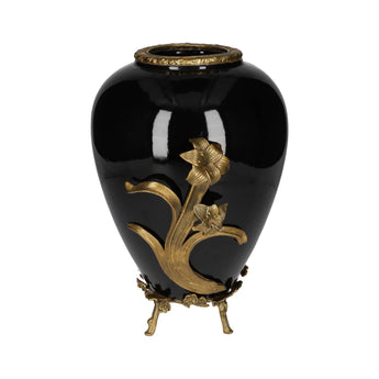 Enhance your décor with this stunning black porcelain vase, beautifully accented with gold-colored floral details. Its sleek design adds a refined touch of luxury and sophistication, making it perfect for displaying fresh or dried flowers. Ideal for modern and classic interiors alike, this elegant vase serves as a striking centerpiece or a thoughtful gift for any special occasion.