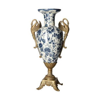 Add sophistication to your interior with this exquisite porcelain and bronze vase featuring ornate swan handles. The detailed blue floral porcelain body rests on a finely crafted bronze base, blending classical European artistry with timeless elegance. Perfect as a statement piece for living rooms, dining areas, or entryways.
