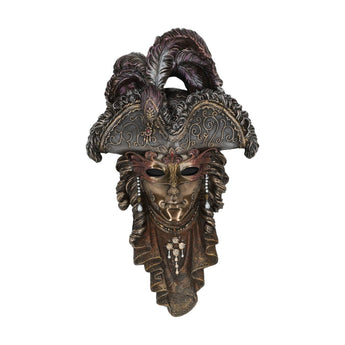 This Venetian wall sculpture features the expressive La Pirata mask with rich textures and ornate detailing. The sculpted face, layered fabrics, and feathered hat create a strong theatrical presence. Deep bronze and muted tones add depth and emotion, making this piece a striking wall accent.