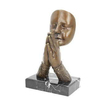 Eine surreale Skulptur im Bronze-Stil eines ruhigen schwebenden Gesichts mit gefalteten Händen. Die kompakte Größe und der schwarze Marmorsockel machen sie zu einem eleganten Blickfang für Regal, Schreibtisch oder Konsole. Ein starkes Symbol für Reflexion und inneren Frieden.