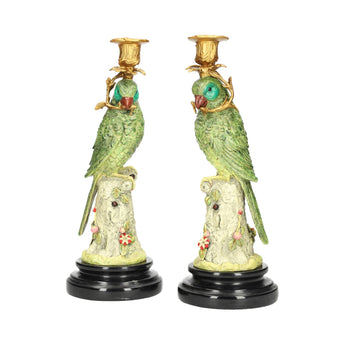 Bringen Sie verspielte Eleganz in Ihr Interieur mit diesem auffälligen Paar Bronze-Papageien-Kerzenhaltern. Jeder Papagei sitzt stolz auf einem dekorativen Marmorsockel, veredelt mit charmanten handbemalten Akzenten und einem feinen Kerzenglas darüber. Mit ihrem lebendigen Charakter und klassischem Aussehen verleihen diese skulpturalen Kerzenhalter jedem Raum Wärme, Farbe und einen Hauch von Vintage-Charme.