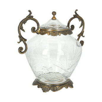 Dieses Glasgefäß mit Deckel verfügt über eine abgerundete Form mit feinem Schliffglas und verzierten Griffen in Goldton.