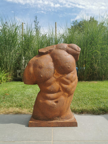 Cette sculpture en fonte saisissante représente un torse masculin puissant avec une forme classique intemporelle. Finie avec une belle patine rouille vintage, elle possède un caractère brut et expressif qui en fait un point focal visuel fort. Conçue comme une grande sculpture de jardin, elle fonctionne également à merveille comme une déclaration artistique en intérieur. La patine de surface évolue naturellement avec le temps, ajoutant profondeur et individualité à la pièce.