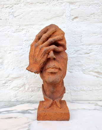 Homme en fonte couvrant le visage patine rouge | 31 cm / 12,4 in | Décor expressif, Art