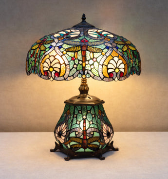 Cette lampe de table de style Tiffany présente un abat-jour en verre teinté richement détaillé avec des motifs de libellules et floraux. Des verts profonds, des bleus, de l'ambre et des tons crème doux créent une lumière en couches, tandis que la base en verre décorative ajoute une forte présence visuelle.