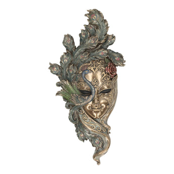 Questa maschera da parete veneziana presenta un design ispirato al pavone con piume stratificate, linee fluide e dettagliata ornamentazione. Toni metallici morbidi combinati con verdi smorzati creano una ricca profondità visiva che aggiunge eleganza e carattere alla decorazione della tua parete.
