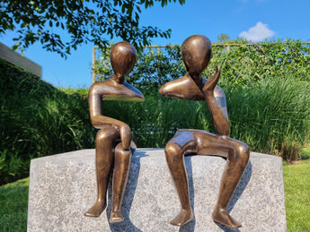 Prachtige abstracte bronzen sculpturen van een dromend paar, ontworpen in langgerekte, serene vormen. Elk figuur is gemaakt om perfect op een rand of verhoogd oppervlak te zitten, wat een poëtische, contemplatieve toets aan uw huis of tuin toevoegt. Hun moderne lijnen en zachte houding stralen rust, romantiek en artistiek karakter uit.