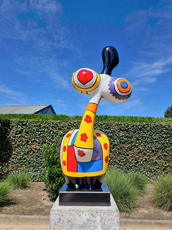 Dit hedendaagse abstracte vrouwenbeeld brengt een gedurfde aanwezigheid en moderne artistieke energie in uw interieur. De zelfverzekerde silhouet en handgeschilderde patronen creëren een krachtige, expressieve uitstraling, terwijl de zwarte natuurstenen voet een verfijnde, premium afwerking toevoegt. Een opvallende blikvanger voor gestileerde ruimtes die van kleur en karakter houden.
