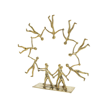 Dit moderne bronzen beeld toont elf abstracte figuren die een volledige cirkel vormen, wat een sterk gevoel van beweging, verbinding en gedeelde energie creëert. De open vorm maakt het een opvallend middelpunt op een sidetable of plank, en het werkt goed als symbolisch cadeau voor teamwork, vriendschap of familiebanden.