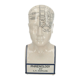 Een porseleinen frenologiehoofd met klassieke gemapte details en een strakke blauwe accentvoet. Het brengt een museumgevoel naar je plank, bureau of boekenkast, perfect voor verzamelaars en nieuwsgierige geesten.