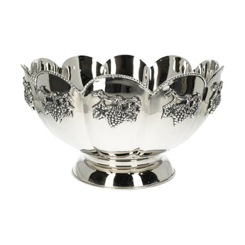 Deze wijnkoelerschaal van messing in zilverkleur heeft een gegolfde rand met gedetailleerde druivenreliëfs.