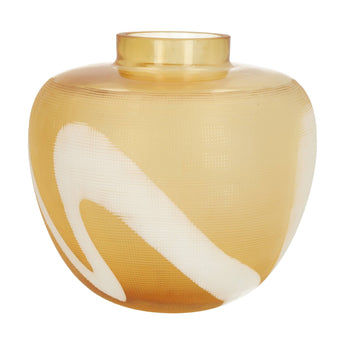This rounded glass vase mixes rich amber with soft white swirls for a cozy, sunny look. The fine grid like texture adds depth and catches the light, so it works as an easy statement piece with or without flowers.
