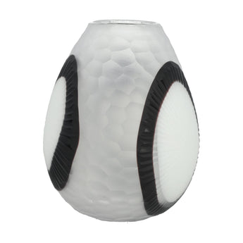 This black and white glass vase has a soft rounded shape with bold oval accents that feel graphic and clean. The frosted finish and subtle texture keep the look calm, so it works as a simple focal point with or without flowers.