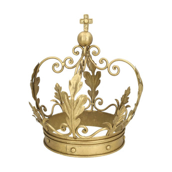 This decorative crown is made from metal and brass tone finishes, shaped with flowing scrollwork and leaf motifs. The cross detail and openwork design give it a strong art nouveau presence for shelves, consoles, and styling vignettes.
