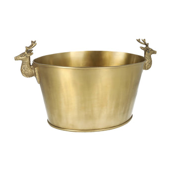 This wine cooler features sculpted deer head handles with a smooth brushed gold finish.