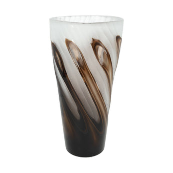 This tall glass vase blends a milky white top with deep smoky tones and amber swirls that flow upward like flame. The subtle spiral texture adds movement without feeling busy, so it stands strong on its own or with a few long stems.