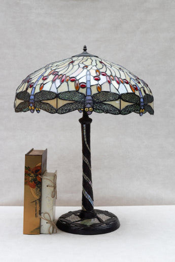 This Tiffany style lamp features an oversized dome shade in creamy stained glass with a classic dragonfly border.