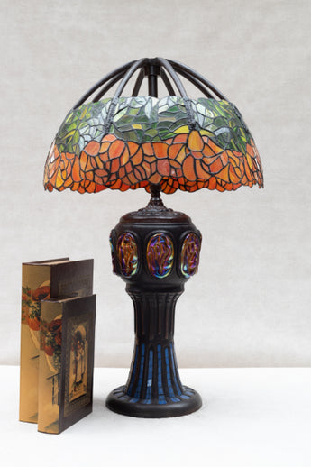 Tiffany Floral Stained Glass Table Lamp | 79.5 cm / 31.3 in | Green and orange shade, iridescent jewel base