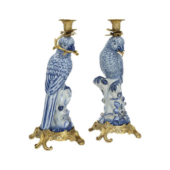 Este notável par de castiçais apresenta papagaios em porcelana pintados à mão segurando um ramo de bronze no bico para suportar a vela. A mistura de porcelana colorida e detalhes em bronze quente torna o conjunto elegante, divertido e verdadeiramente cativante. Um duo de destaque para interiores requintados, perfeito para decorar um aparador, mesa de jantar ou consola.