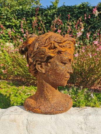 Um busto sereno em ferro fundido que adiciona beleza clássica e charme envelhecido a qualquer espaço.