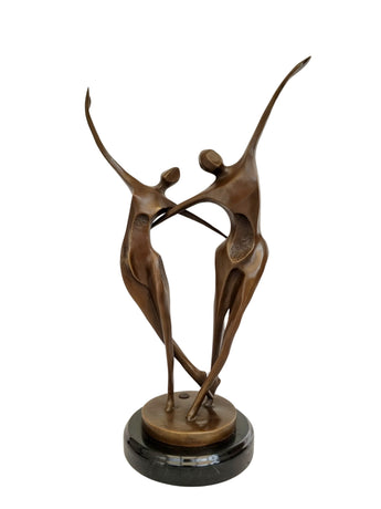 Uma obra de arte em bronze lindamente trabalhada de duas figuras a dançar, desenhada num estilo abstrato e moderno. Esta escultura elegante captura o movimento, a conexão e a harmonia, tornando-a uma peça decorativa perfeita para amantes da dança e um presente atencioso para um parceiro de dança ou professor de dança.