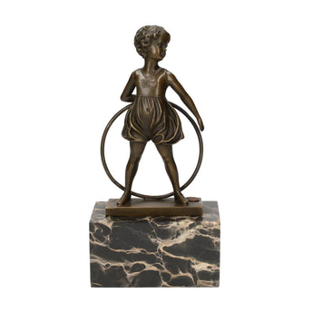 Uma graciosa escultura em bronze da Menina do Aro, desenhada com postura expressiva e detalhe encantador. Esta figura refinada captura o movimento e a elegância juvenil, tornando-se uma peça decorativa adorável para interiores modernos e clássicos.