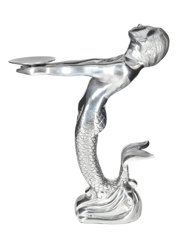 Uma cativante escultura de sereia em alumínio com acabamento espelhado, concebida tanto como obra de arte quanto como um acento funcional. A figura graciosa surge de ondas estilizadas e estende os braços para segurar um prato raso, criando um centro de mesa impressionante que combina a beleza mítica com o brilho moderno.