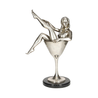 Uma escultura em bronze impressionante que representa uma mulher elegantemente posada dentro de um grande copo de cocktail. Esta obra imaginativa e expressiva combina elegância com charme divertido, tornando-se uma peça central cativante para interiores modernos, bares ou coleções de arte.