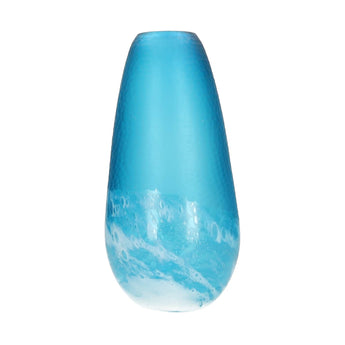 Um vaso em vidro cortado à mão, lindamente trabalhado, num tom vibrante de azul claro. A sua forma suave, textura subtil e mistura dinâmica de cores fazem dele uma peça central de destaque para qualquer interior moderno. Perfeito para arranjos florais ou como peça decorativa artística por si só.