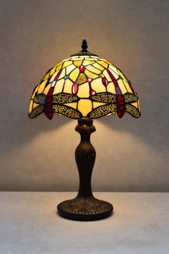 Esta lâmpada de mesa estilo Tiffany apresenta um abajur de vitral com motivos de libélulas e tons quentes de creme, verde e vermelho. A base esculpida e o trabalho detalhado em vidro criam uma luz suave e atmosférica que se adequa a interiores clássicos e ricos em carácter.