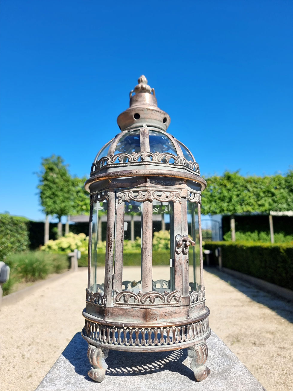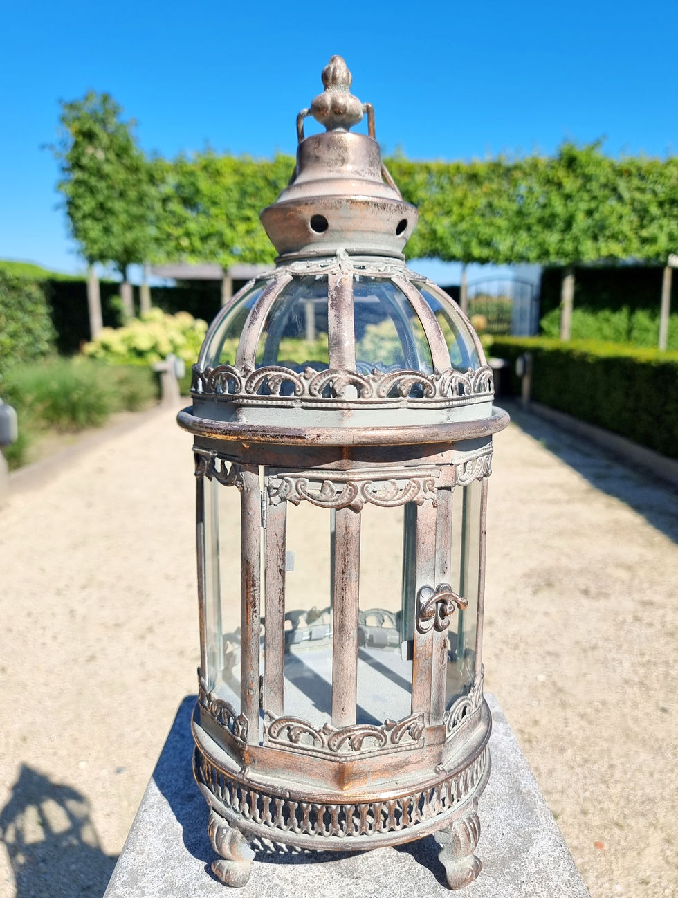 Questa è una bellissima lanterna in metallo/ottone di alta qualità. Lanterna decorata molto bene con 22 bicchieri. Questa lanterna è alta 48 cm, che equivale a 19,3 pollici. La lanterna dà un effetto meraviglioso quando si accende una grande candela al suo interno. Può essere utilizzata sia all'interno che all'esterno.